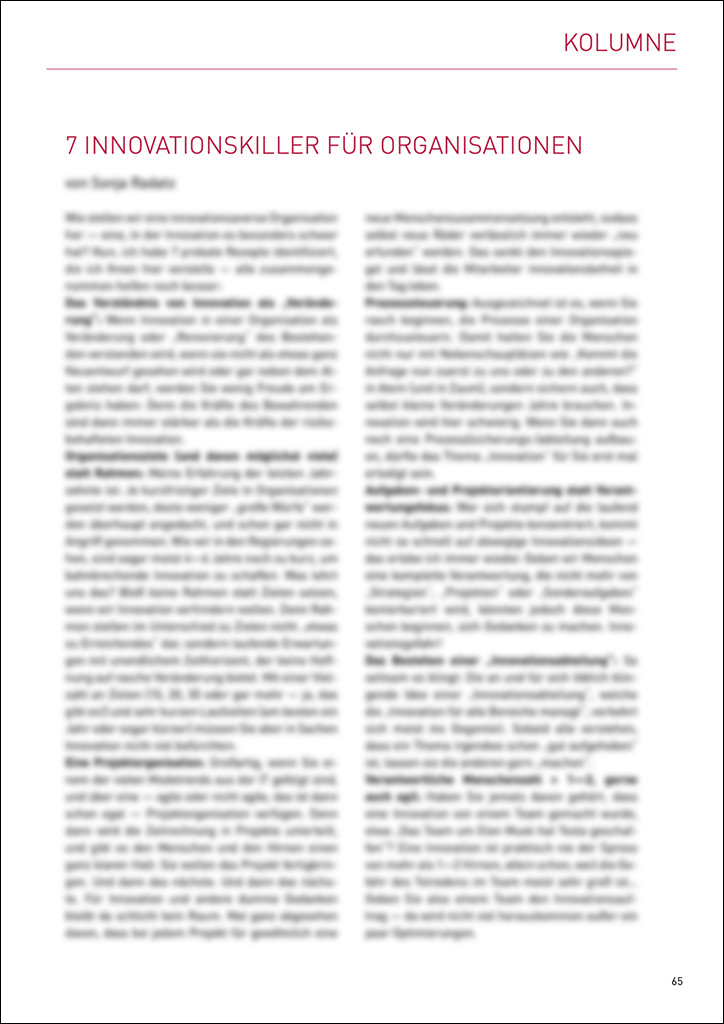 Das Verständnis von Innovation als „Veränderung“: Wenn Innovation in einer Organisation als Veränderung oder „Renovierung“ des Bestehenden verstanden wird, wenn sie nicht als etwas ganz Neuentwurf gesehen wird oder gar neben dem Alten stehen darf, werden Sie wenig Freude am Ergebnis haben: Denn die Kräfte des Bewahrenden sind dann immer stärker als die Kräfte der risikobehafteten Innovation.