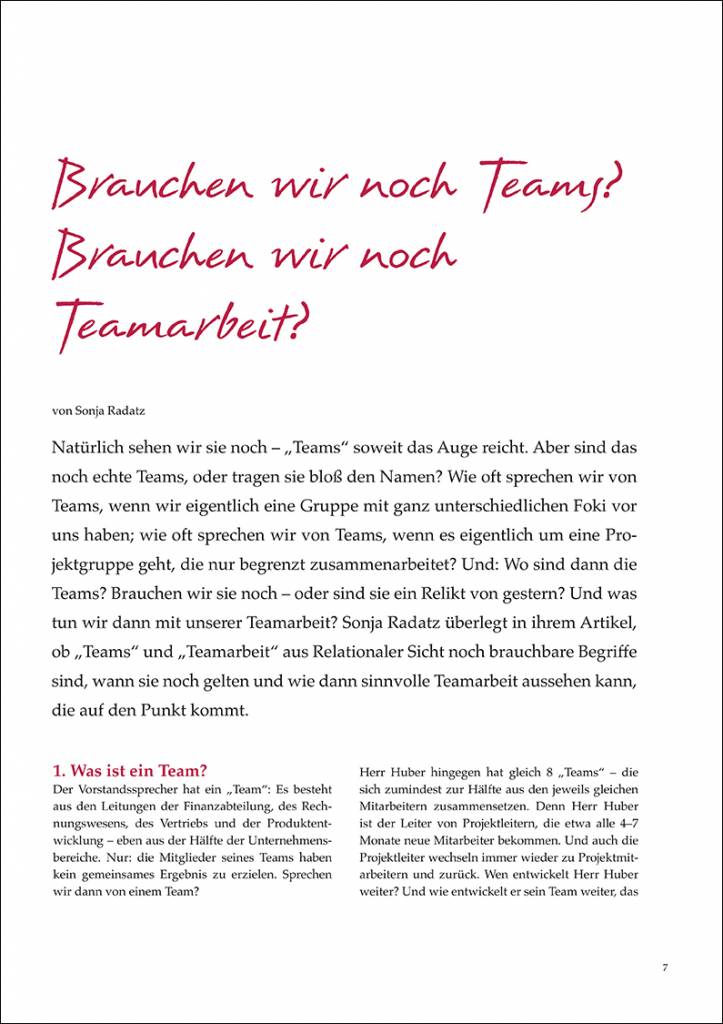 Brauchen wir noch Teams? Brauchen wir noch Teamarbeit? von Sonja Radatz Natürlich sehen wir sie noch – „Teams“ soweit das Auge reicht. Aber sind das noch echte Teams, oder tragen sie bloß den Namen? Wie oft sprechen wir von Teams, wenn wir eigentlich eine Gruppe mit ganz unterschiedlichen Foki vor uns haben; wie oft sprechen wir von Teams, wenn es eigentlich um eine Pro- jektgruppe geht, die nur begrenzt zusammenarbeitet? Und: Wo sind dann die Teams? Brauchen wir sie noch – oder sind sie ein Relikt von gestern? Und was tun wir dann mit unserer Teamarbeit? Sonja Radatz überlegt in ihrem Artikel, ob „Teams“ und „Teamarbeit“ aus Relationaler Sicht noch brauchbare Begri e sind, wann sie noch gelten und wie dann sinnvolle Teamarbeit aussehen kann, die auf den Punkt kommt.