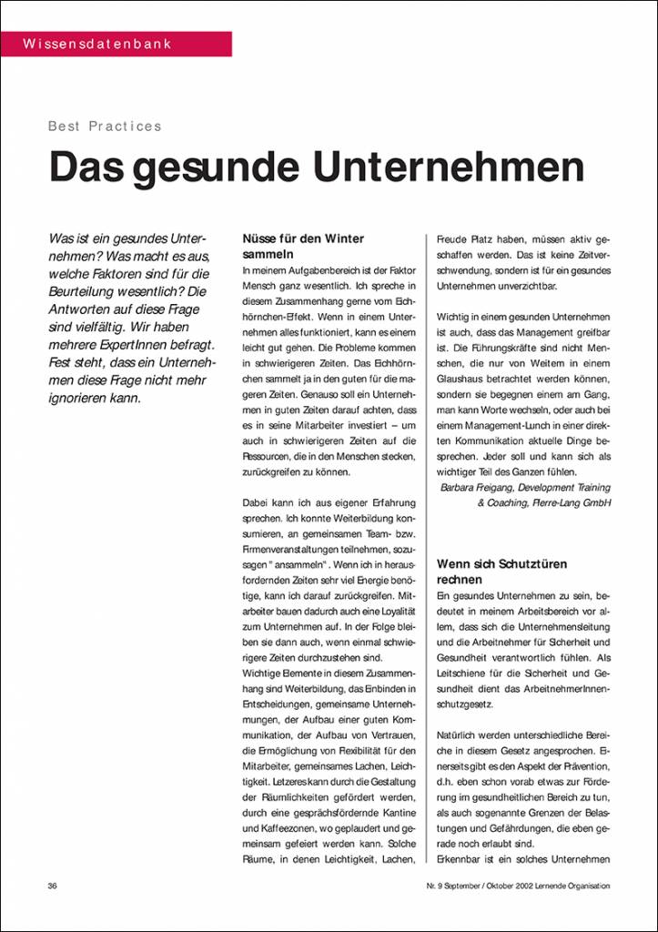 Das gesunde Unternehmen Was ist ein gesundes Unternehmen? Was macht es aus, welche Faktoren sind für die Beurteilung wesentlich? Die Antworten auf diese Fragen sind vielfältig. Wir haben mehrere ExpertInnen befragt. Fest steht, dass ein Unternehmen diese