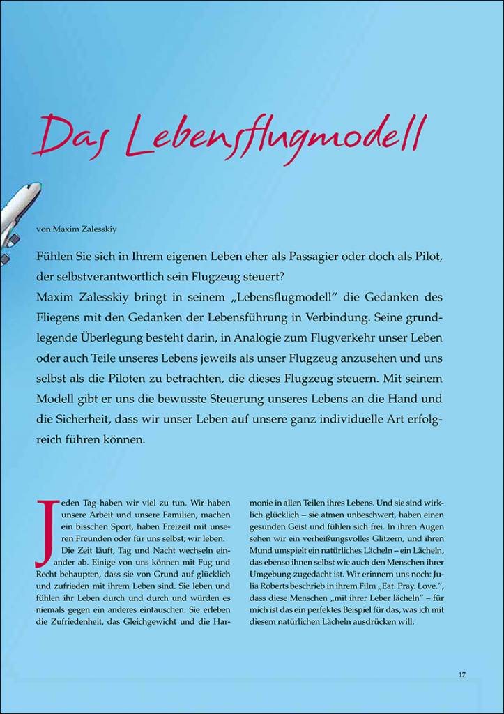 von Maxim ZalesskiyFühlen Sie sich in Ihrem eigenen Leben eher als Passagier oder doch als Pilot, der selbstverantwortlich sein Flugzeug steuert?Maxim Zalesskiy bringt in seinem „Lebensflugmodell“ die Gedanken des Fliegens mit den Gedanken der Lebensführu