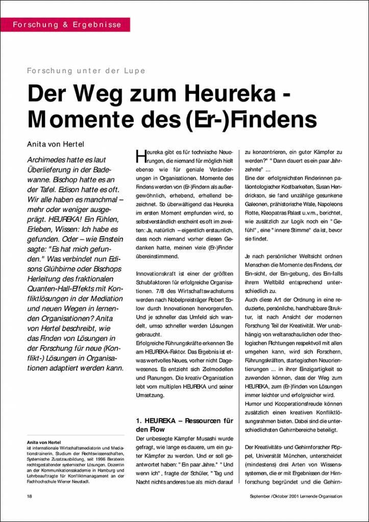 Der Weg zum Heureka - Momente des (Er-)Findens von Anita von Hertel Archimedes hatte es laut Überlieferung in der Badewanne. Bischop hatte es an der Tafel. Edison hatte es oft. Wir alle haben es manchmal – mehr oder weniger ausgeprägt. HEUREKA! Ein Fühlen, Erleben, Wissen: Ich habe es gefunden. Oder – wie Einstein sagte: "Es hat mich gefunden." Was verbindet nun Edisons Glühbirne oder Bischops Herleitung des fraktionalen Quanten-Hall-Effekts mit Konfliktlösungen in der Mediation und neuen Wegen in lernenden Organisationen? Anita von Hertel beschreibt, wie das Finden von Lösungen in der Forschung für neue (Konflikt-) Lösungen in Organisationen adaptiert werden kann.