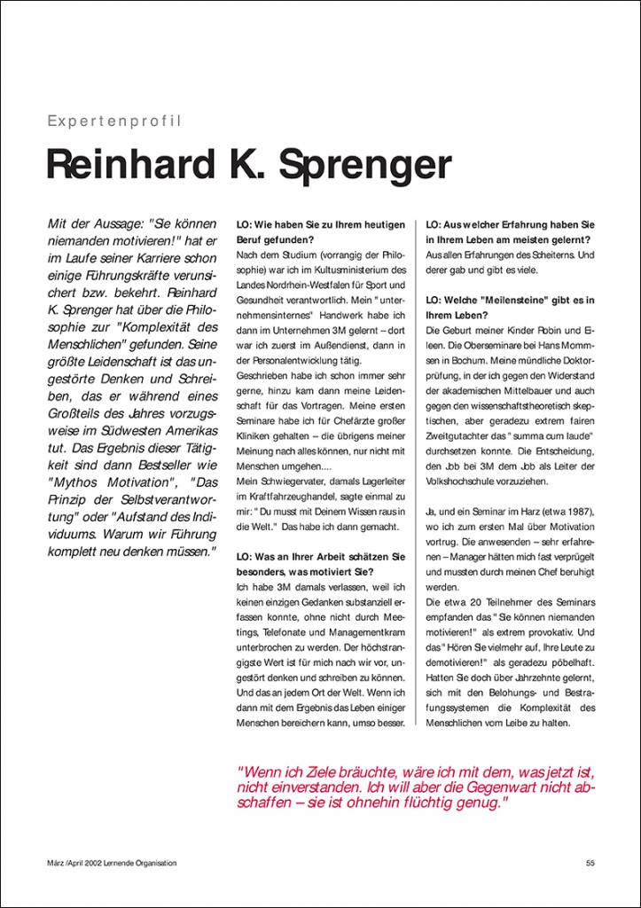 Expertenprofil: Reinhard K. Sprenger Mit der Aussage: "Sie können niemanden motivieren!" hat er im Laufe seiner Karriere schon einige Führungskräfte verunsichert bzw. bekehrt. Reinhard K. Sprenger hat über die Philosophie zur "Komplexität des Menschlichen" gefunden. Seine größte Leidenschaft ist das ungestörte Denken und Schreiben, das er während eines Großteils des Jahres vorzugsweise im Südwesten Amerikas tut. Das Ergebnis dieser Tätigkeit sind dann Bestseller wie "Mythos Motivation", "Das Prinzip der Selbstverantwortung" oder "Aufstand des Individuums. Warum wir Führung komplett neu denken müssen."