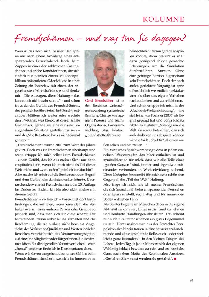 Fremdschämen – und was tun Sie dagegen? von Gerd Brandstätter Wem ist das noch nicht passiert: Ich gönne mir nach einem Arbeitstag einen entspannenden Fernsehabend, lande beim Zappen in einer der zahlreichen Castingshows und erlebe KandidatInnen, die sich einfach nur peinlich einem Millionenpublikum präsentieren. Oder ich lese in einer Zeitung ein Interview mit einem der angesehensten Wirtschaftsbosse und denke mir: „Die Aussagen, diese Haltung – das kann doch nicht wahr sein…“ – und schon ist es da, das Gefühl des Fremdschämens, des peinlich berührt Seins....