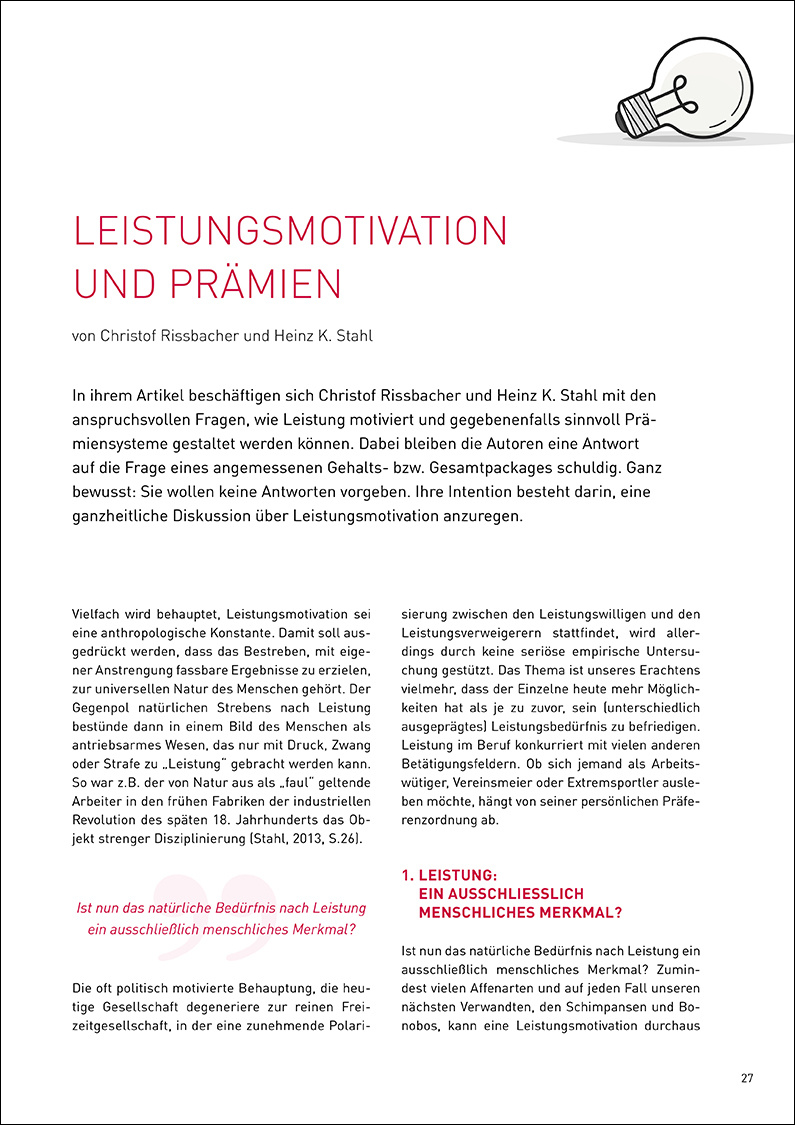 In ihrem Artikel beschäftigen sich Christof Rissbacher und Heinz K. Stahl mit den anspruchsvollen Fragen, wie Leistung motiviert und gegebenenfalls sinnvoll Prämiensysteme gestaltet werden können. Dabei bleiben die Autoren eine Antwort auf die Frage eines angemessenen Gehalts- bzw. Gesamtpackages schuldig. Ganz bewusst: Sie wollen keine Antworten vorgeben. Ihre Intention besteht darin, eine ganzheitliche Diskussion über Leistungsmotivation anzuregen.