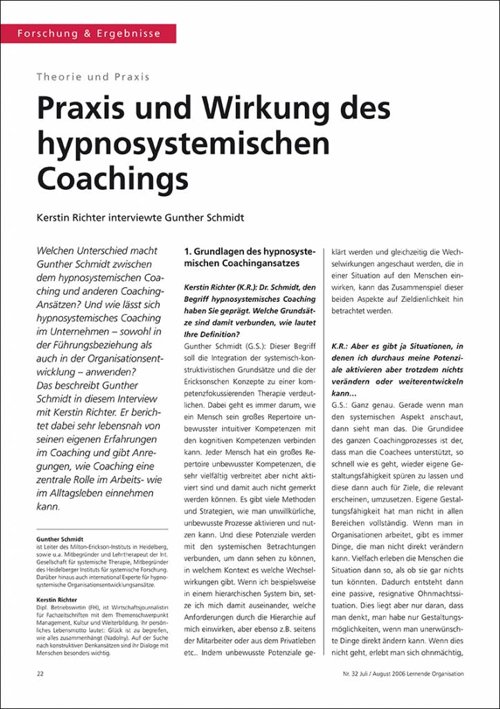 Praxis und Wirkung des hypnosystemischen Coachings von Kerstin Richter interviewte Gunther Schmidt Welchen Unterschied macht Gunther Schmidt zwischen dem hypnosystemischen Coaching und anderen Coaching- Ansätzen? Und wie lässt sich hypnosystemisches Coaching im Unternehmen – sowohl in der Führungsbeziehung als auch in der Organisationsentwicklung – anwenden? Das beschreibt Gunther Schmidt in diesem Interview mit Kerstin Richter. Er berichtet dabei sehr lebensnah von seinen eigenen Erfahrungen im Coaching und gibt Anregungen, wie Coaching eine zentrale Rolle im Arbeits- wie im Alltagsleben einnehmen kann.
