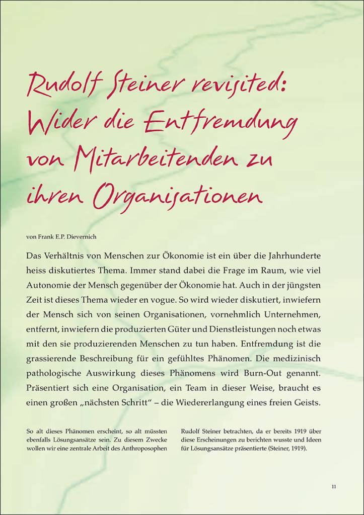 Rudolf Steiner revisited: Wider die Entfremdung von Mitarbeitenden zu ihren Organisationen von Frank E.P. Dievernich Das Verhältnis von Menschen zur Ökonomie ist ein über die Jahrhunderte heiss diskutiertes Thema. Immer stand dabei die Frage im Raum, wie viel Autonomie der Mensch gegenüber der Ökonomie hat. Auch in der jüngsten Zeit ist dieses Thema wieder en vogue. So wird wieder diskutiert, inwiefern der Mensch sich von seinen Organisationen, vornehmlich Unternehmen, entfernt, inwiefern die produzierten Güter und Dienstleistungen noch etwas mit den sie produzierenden Menschen zu tun haben. Entfremdung ist die grassierende Beschreibung für ein gefühltes Phänomen. Die medizinisch pathologische Auswirkung dieses Phänomens wird Burn-Out genannt. Präsentiert sich eine Organisation, ein Team in dieser Weise, braucht es einen großen „nächsten Schritt“ – die Wiedererlangung eines freien Geists.