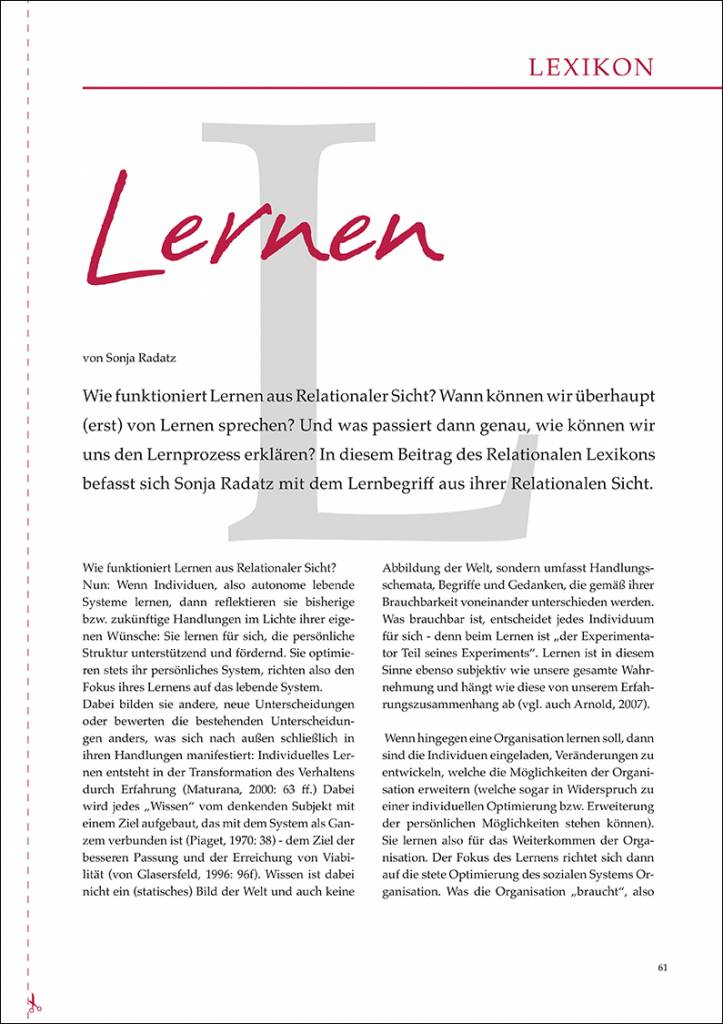 Lernen von Sonja Radatz Wie funktioniert Lernen aus Relationaler Sicht? Wann können wir überhaupt (erst) von Lernen sprechen? Und was passiert dann genau, wie können wir uns den Lernprozess erklären? In diesem Beitrag des Relationalen Lexikons befasst sich Sonja Radatz mit dem Lernbegriff aus ihrer Relationalen Sicht.