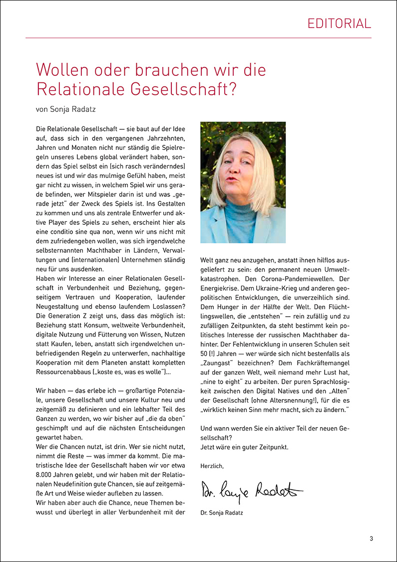 Die Relationale Gesellschaft — sie baut auf der Idee auf, dass sich in den vergangenen Jahrzehnten, Jahren und Monaten nicht nur ständig die Spielregeln unseres Lebens global verändert haben, sondern das Spiel selbst ein (sich rasch veränderndes) neues ist und wir das mulmige Gefühl haben, meist gar nicht zu wissen, in welchem Spiel wir uns gera‐ de befinden, wer Mitspieler darin ist und was „gerade jetzt“ der Zweck des Spiels ist. Ins Gestalten zu kommen und uns als zentrale Entwerfer und aktive Player des Spiels zu sehen, erscheint hier als eine conditio sine qua non, wenn wir uns nicht mit dem zufriedengeben wollen, was sich irgendwelche selbsternannten Machthaber in Ländern, Verwaltungen und (internationalen) Unternehmen ständig neu für uns ausdenken.