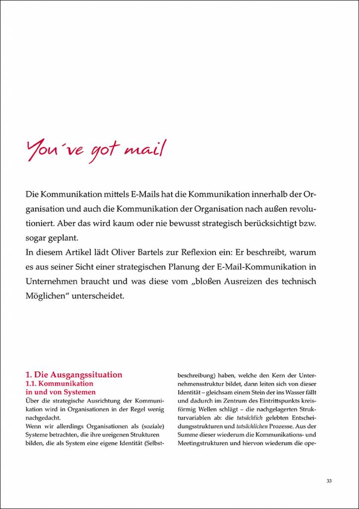 You´ve got mail von Oliver Bartels Die Kommunikation mittels E-Mails hat die Kommunikation innerhalb der Organisation und auch die Kommunikation der Organisation nach außen revolutioniert. Aber das wird kaum oder nie bewusst strategisch berücksichtigt bzw